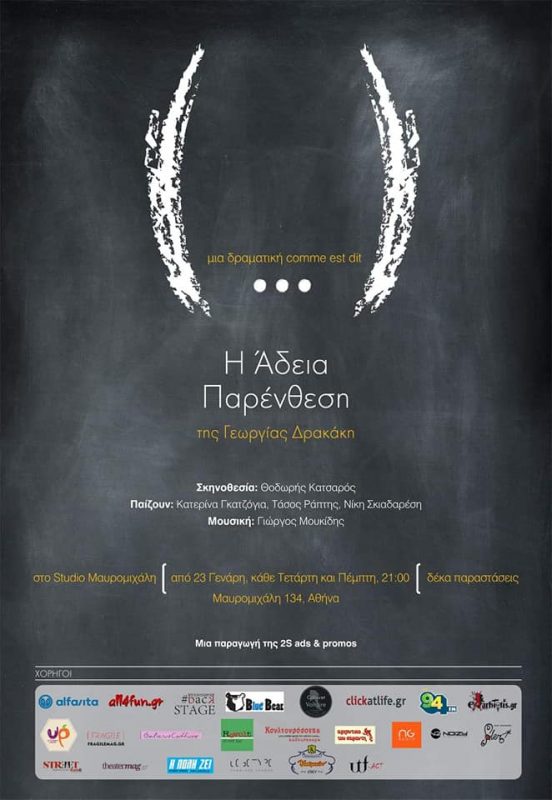 Κάθε Τετάρτη και Πέμπτη από 23/1/2019 έως 8/3/2019 θα χαρώ να έρθετε στη θεατρική παράσταση “Η Άδεια Παρένθεση” της Γεωργίας Δρακάκη που πρωταγωνιστώ μαζί με τους Τάσο Ράπτη και Νίκη Σκιαδαρέση στις 21:00 στο studio Μαυρομιχάλη. (Μαυρομιχάλη 134 ).